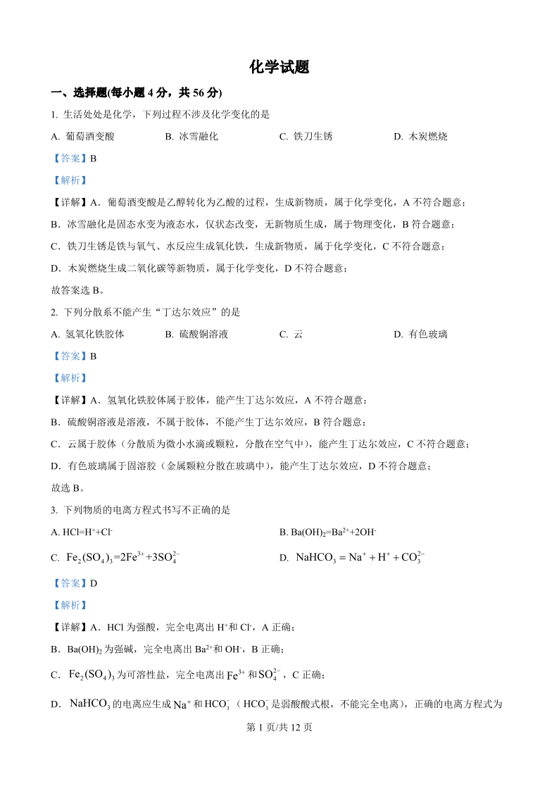 高一化学(精品解析版)--陕西省汉中市西乡县第一中学2025-2026学年高一上学期9月月考