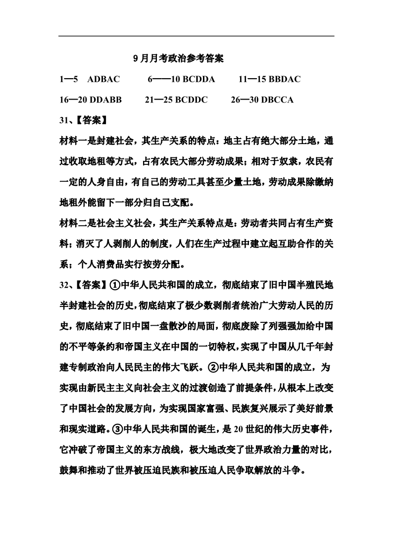 高一政治答案--陕西省汉中市西乡县第一中学2025-2026学年高一上学期9月月考