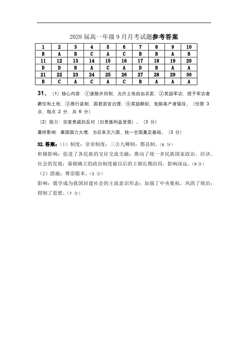 高一历史答案--陕西省汉中市西乡县第一中学2025-2026学年高一上学期9月月考