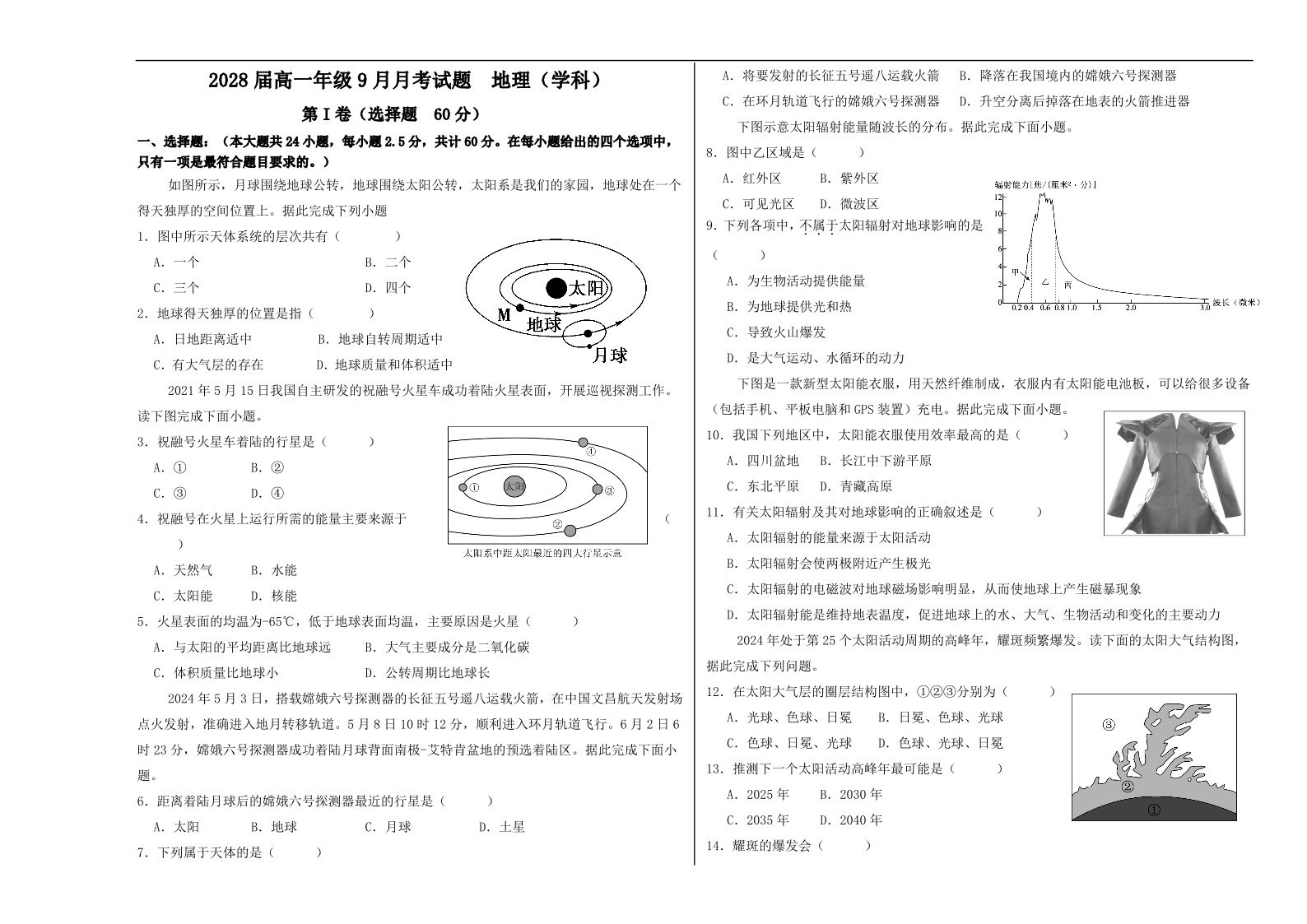 高一地理--陕西省汉中市西乡县第一中学2025-2026学年高一上学期9月月考