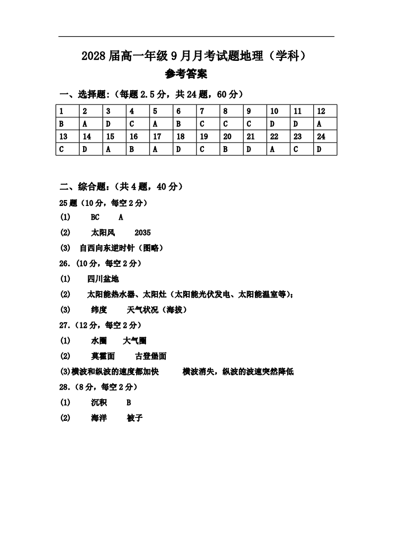 高一地理答案--陕西省汉中市西乡县第一中学2025-2026学年高一上学期9月月考