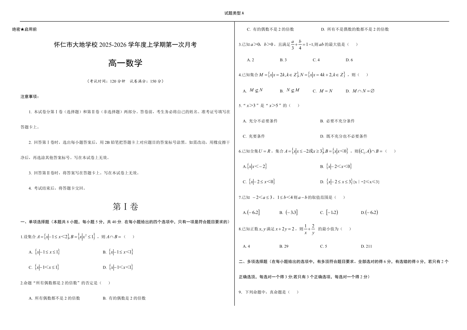 高一数学(A)--山西省朔州市怀仁市大地高中学校2025-2026学年高一上学期第一次月考