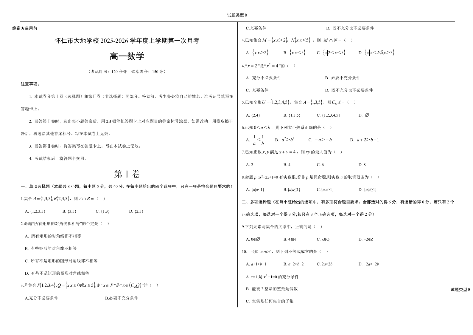 高一数学(B)--山西省朔州市怀仁市大地高中学校2025-2026学年高一上学期第一次月考