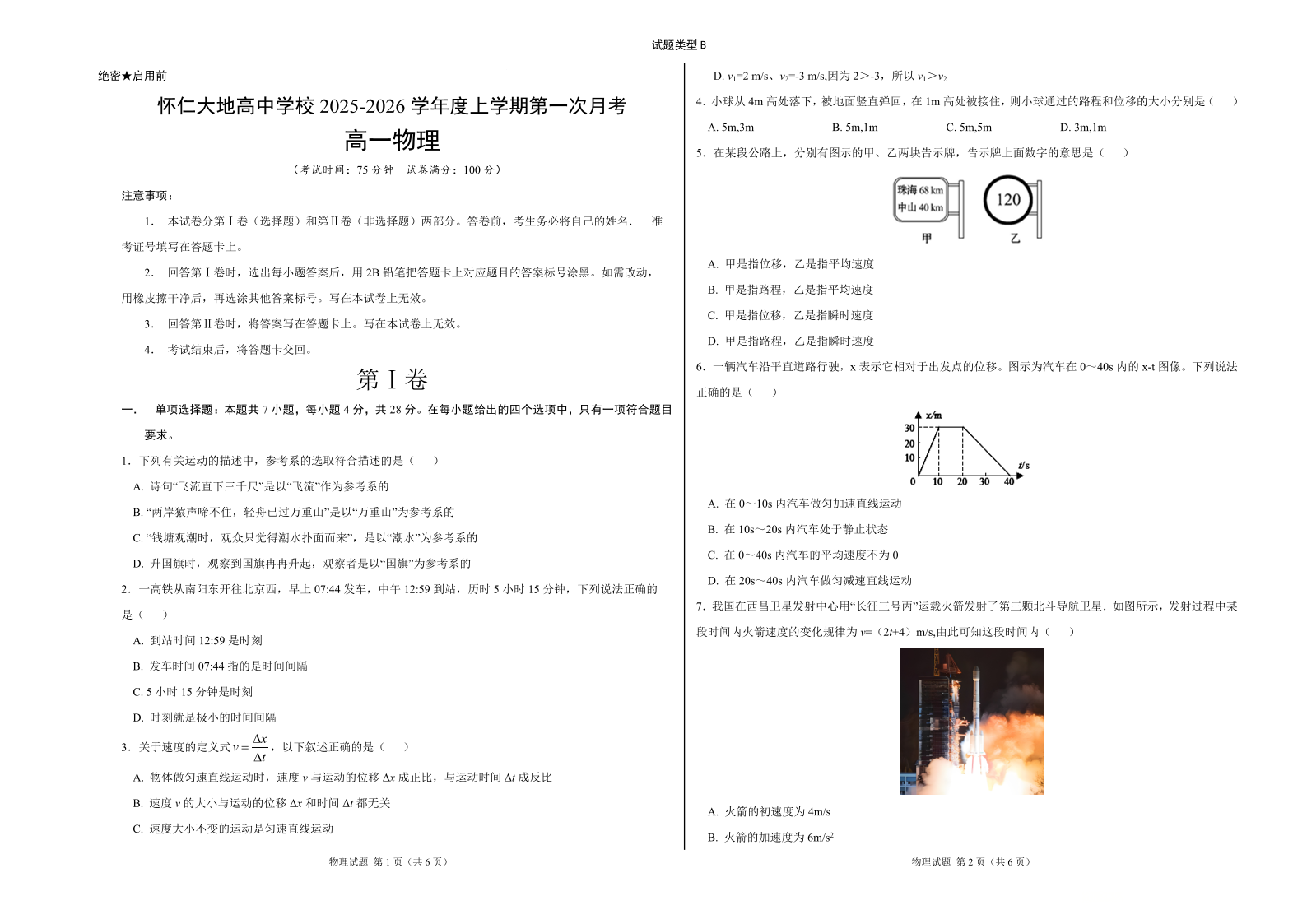 高一物理--山西省朔州市怀仁市大地高中学校2025-2026学年高一上学期第一次月考