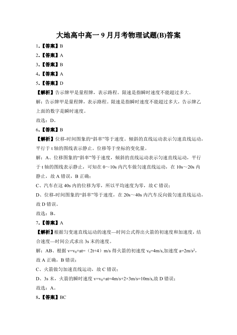 高一物理(B)答案--山西省朔州市怀仁市大地高中学校2025-2026学年高一上学期第一次月考