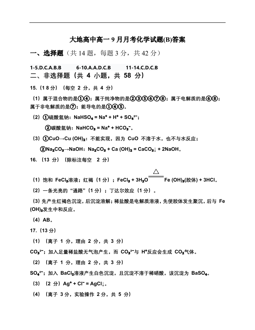 高一化学(B)答案--山西省朔州市怀仁市大地高中学校2025-2026学年高一上学期第一次月考