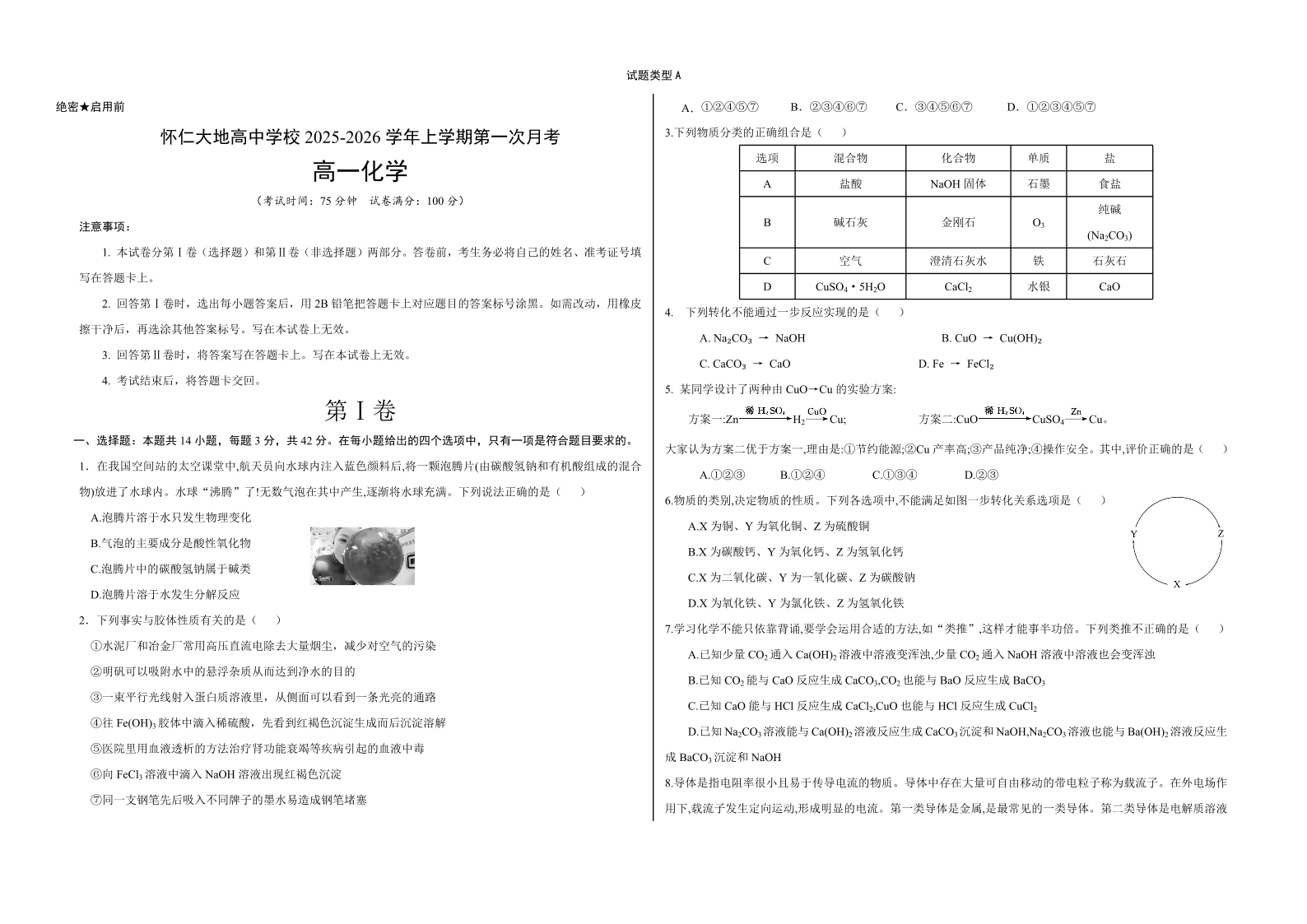 高一化学--山西省朔州市怀仁市大地高中学校2025-2026学年高一上学期第一次月考