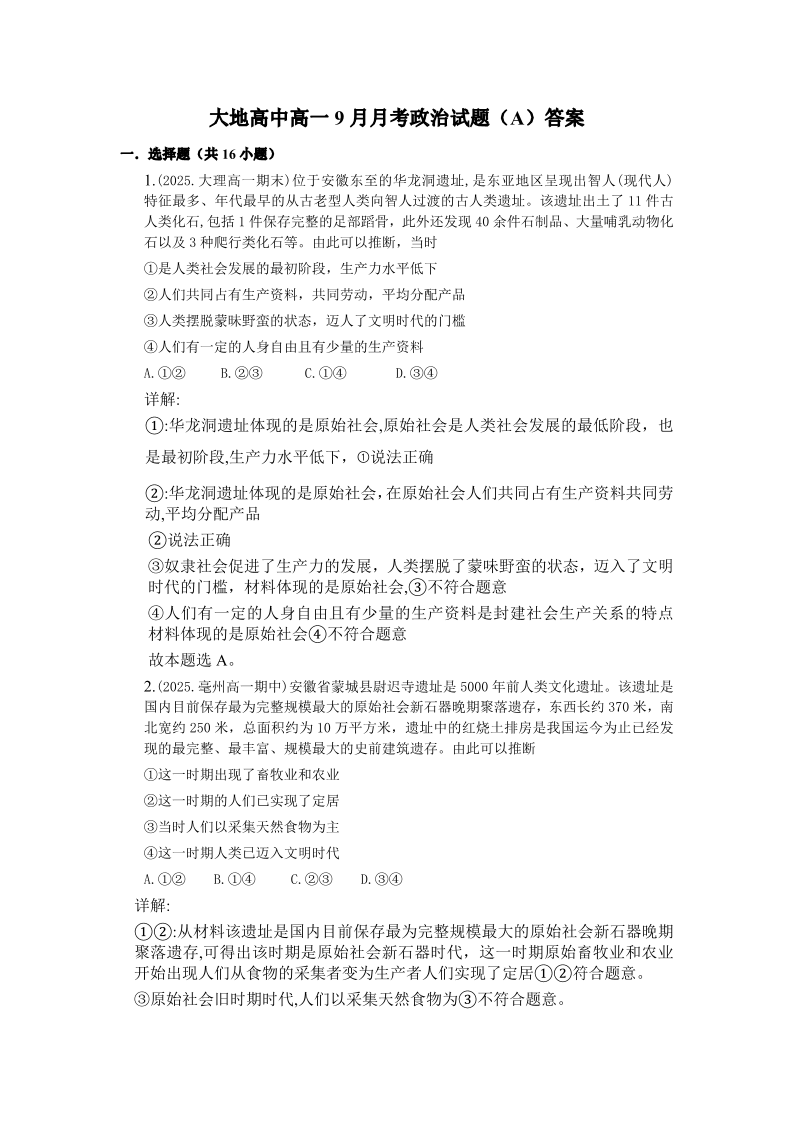 高一政治(A)答案--山西省朔州市怀仁市大地高中学校2025-2026学年高一上学期第一次月考