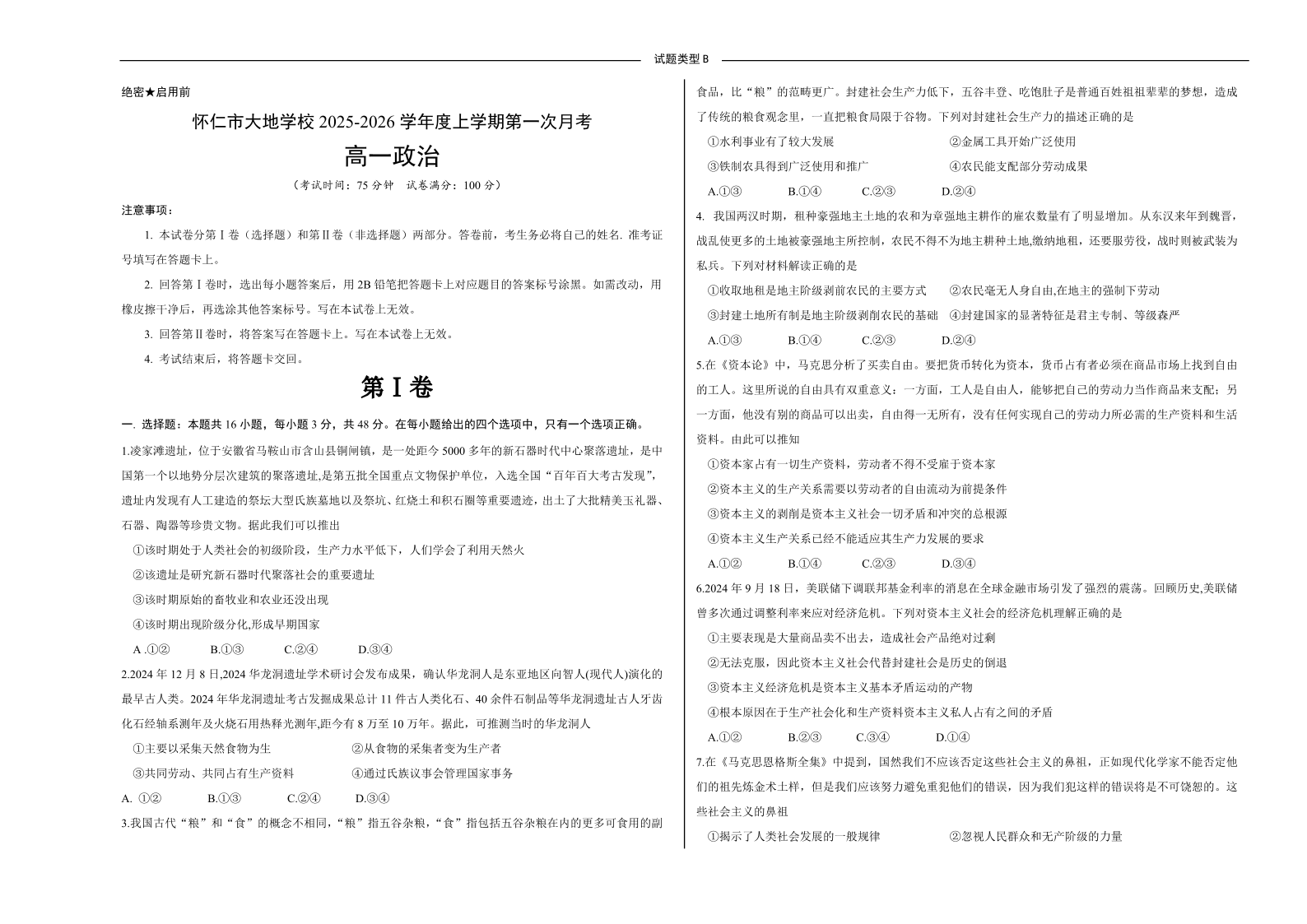 高一政治--山西省朔州市怀仁市大地高中学校2025-2026学年高一上学期第一次月考