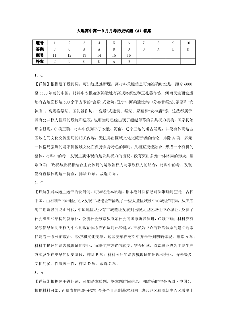 高一历史(A)答案--山西省朔州市怀仁市大地高中学校2025-2026学年高一上学期第一次月考