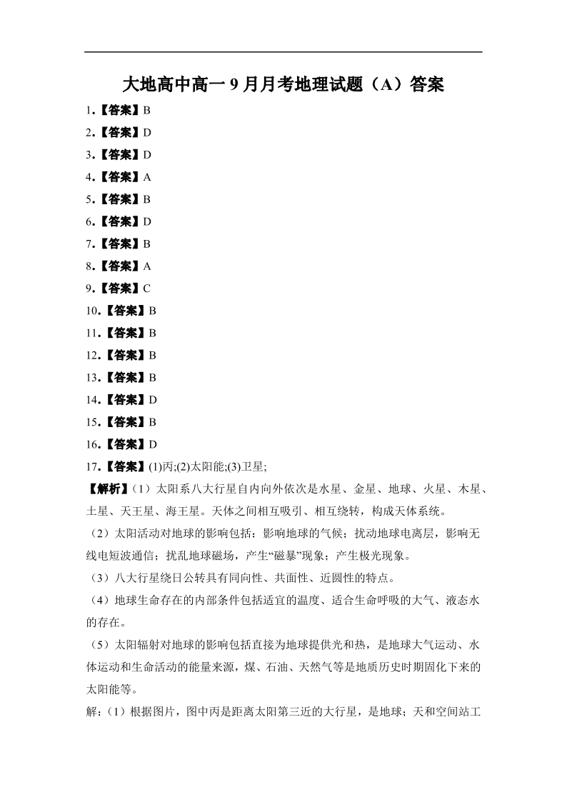 高一地理(A)答案--山西省朔州市怀仁市大地高中学校2025-2026学年高一上学期第一次月考