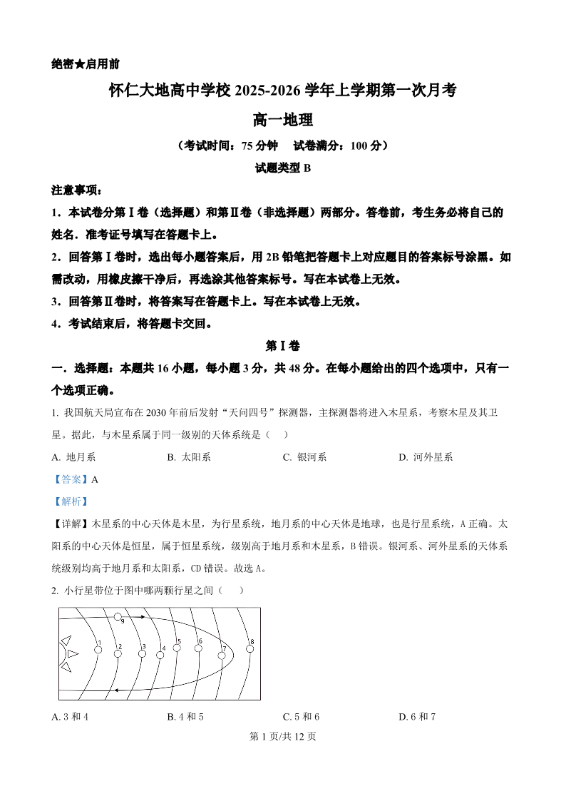 高一地理B卷(精品解析版)--山西省朔州市怀仁市大地高中学校2025-2026学年高一上学期第一次月考