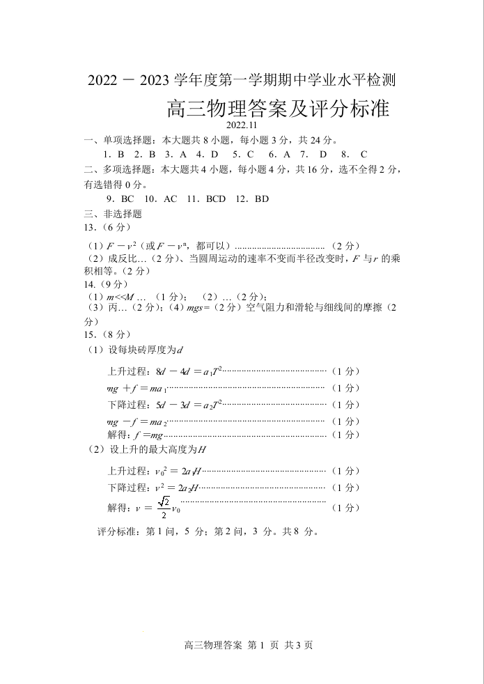 高三物理答案--山东省青岛区域2023届高三上学期期中考试