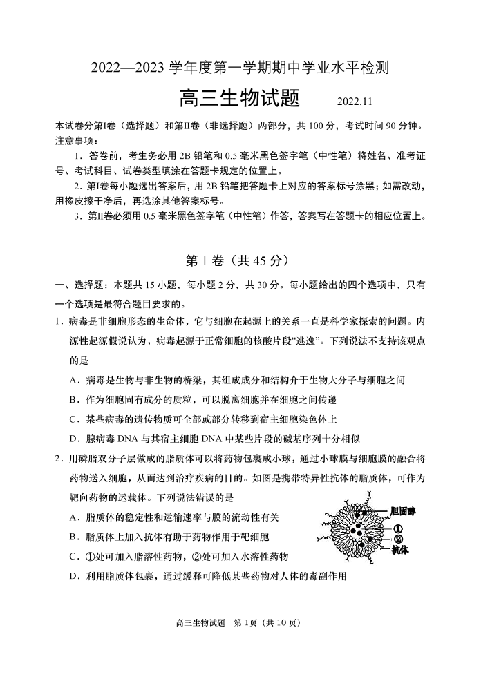 高三生物--山东省青岛区域2023届高三上学期期中考试