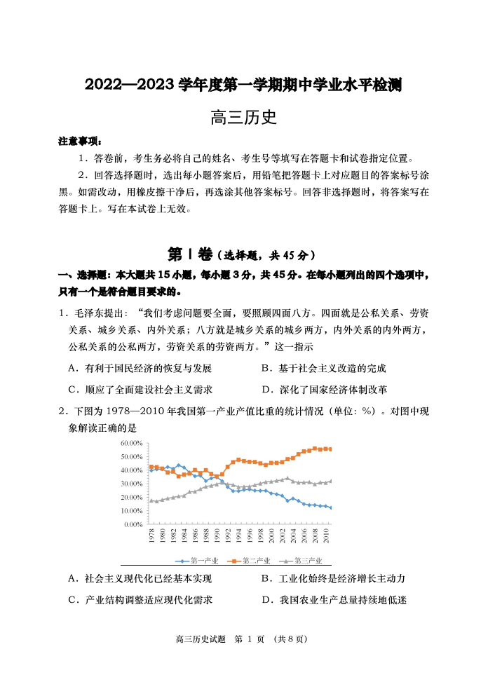 高三历史--山东省青岛区域2023届高三上学期期中考试