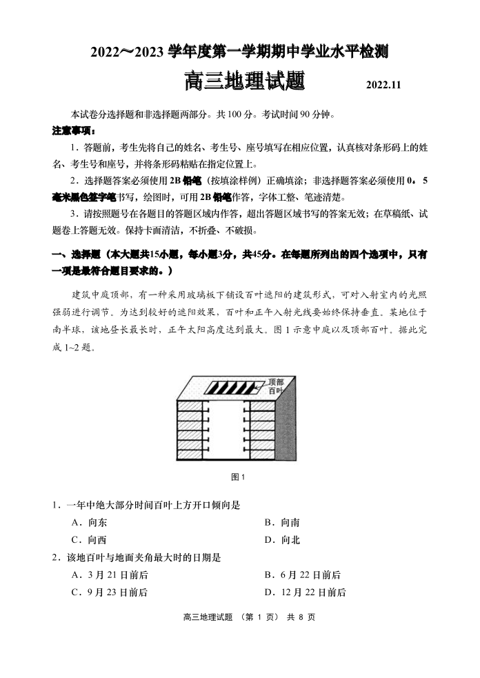 高三地理--山东省青岛区域2023届高三上学期期中考试