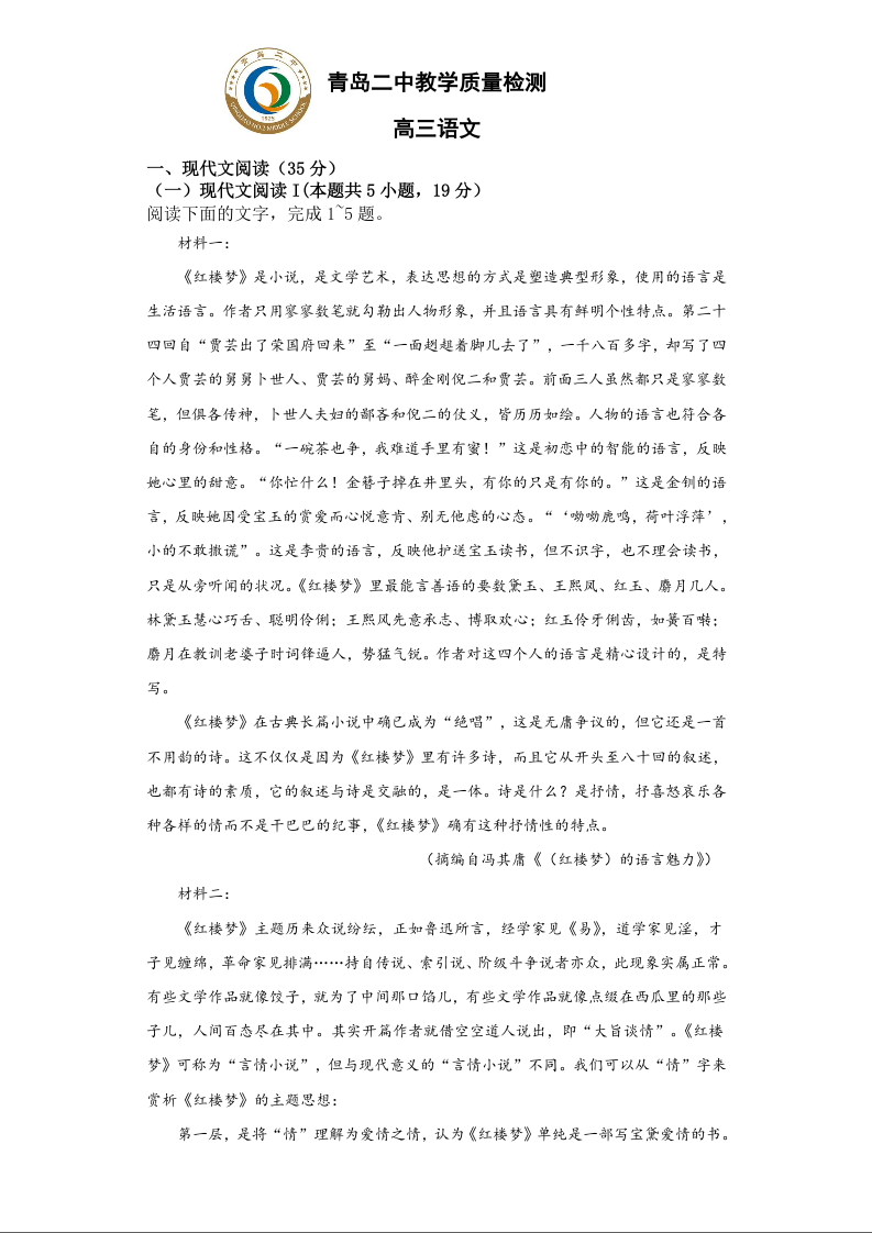高三语文+答案--山东省青岛市第二中学2022-2023学年高三上学期12月月考