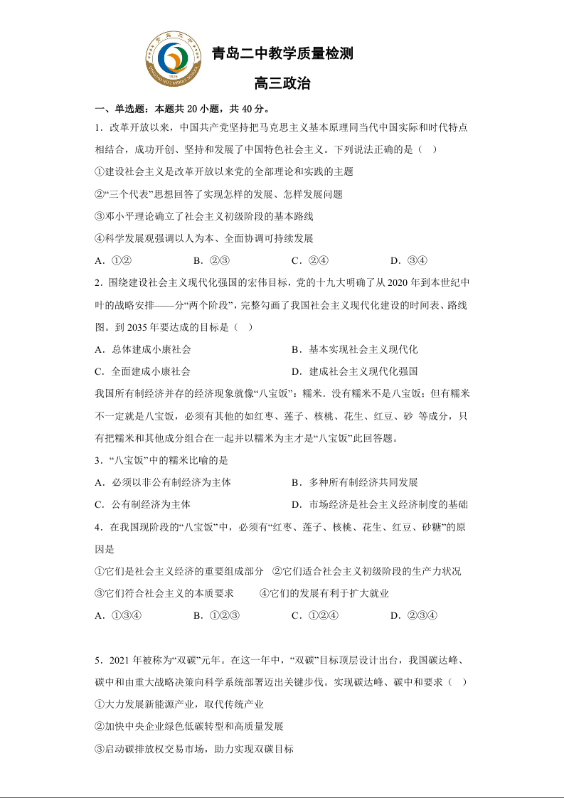 高三政治+答案--山东省青岛市第二中学2022-2023学年高三上学期12月月考
