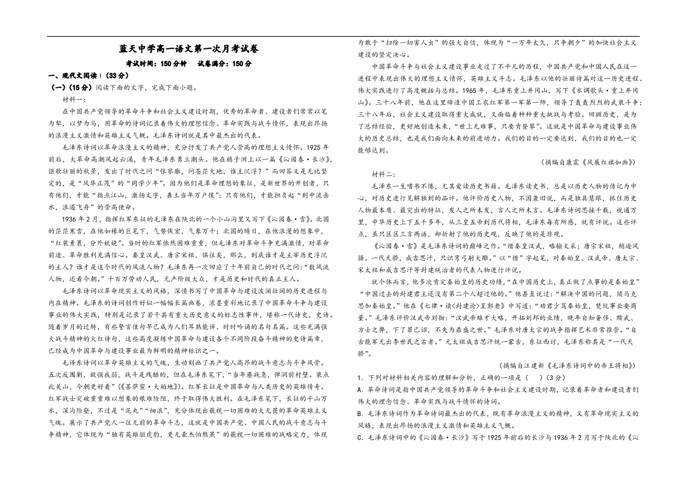 高一语文--江西省上饶市余干县私立蓝天中学2025-2026学年高一上学期第一次月考