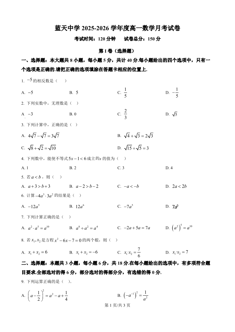 高一数学(原卷版)--江西省上饶市余干县私立蓝天中学2025-2026学年高一上学期第一次月考