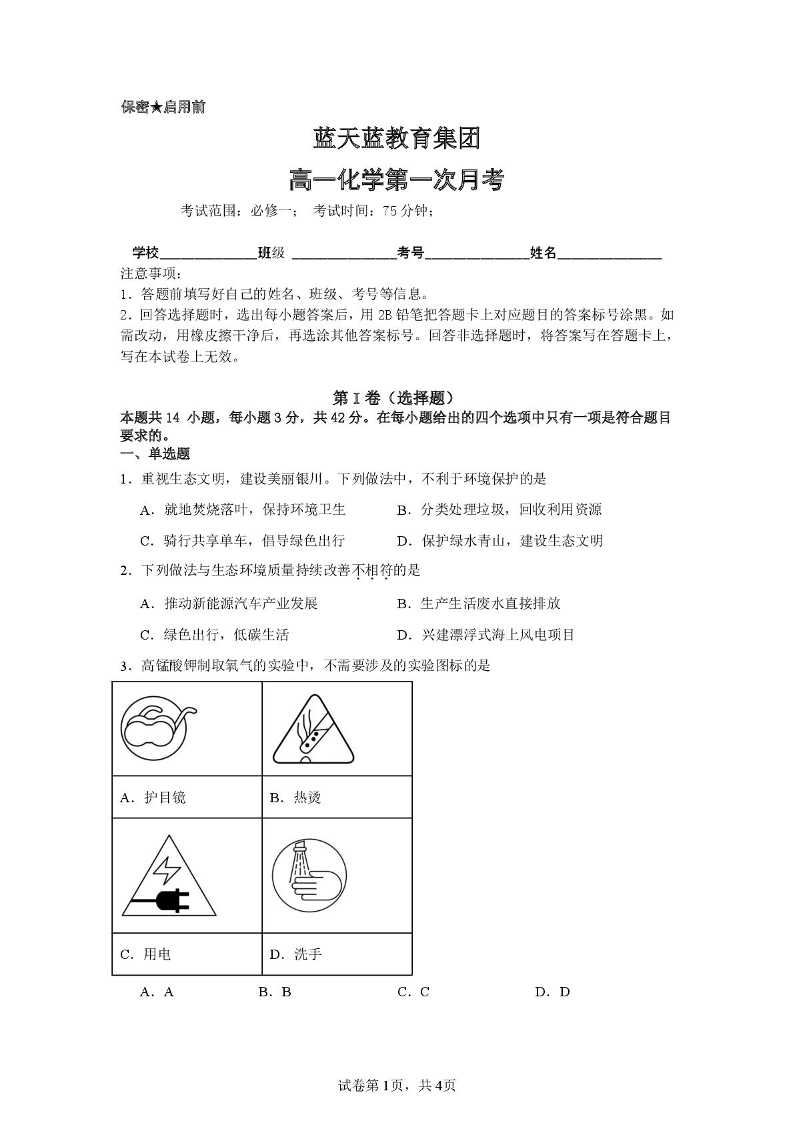 高一化学--江西省上饶市余干县私立蓝天中学2025-2026学年高一上学期第一次月考