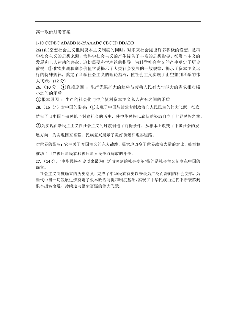 高一政治答案--江西省上饶市余干县私立蓝天中学2025-2026学年高一上学期第一次月考