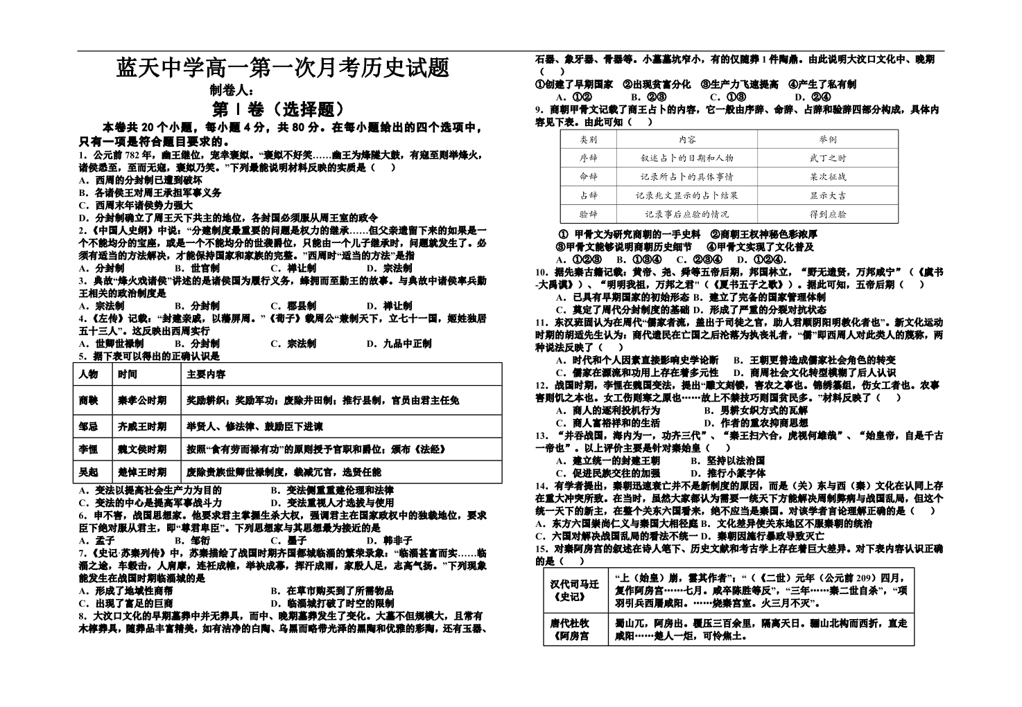 高一历史--江西省上饶市余干县私立蓝天中学2025-2026学年高一上学期第一次月考