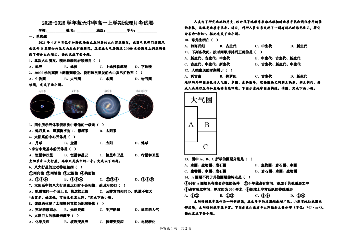 高一地理--江西省上饶市余干县私立蓝天中学2025-2026学年高一上学期第一次月考