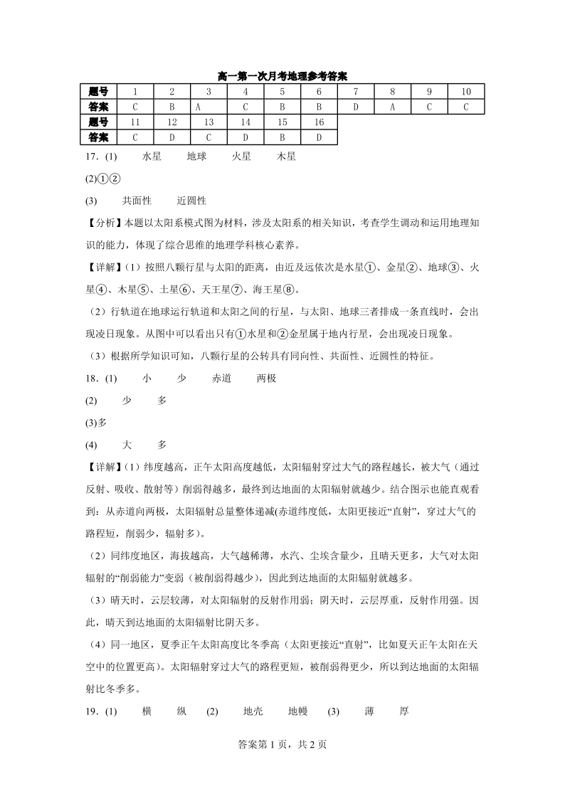 高一地理答案--江西省上饶市余干县私立蓝天中学2025-2026学年高一上学期第一次月考