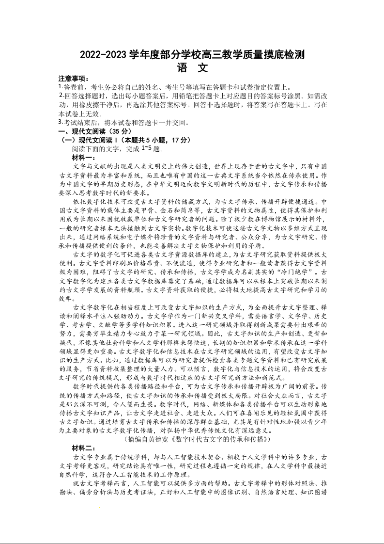 高三语文+答案--山东省淄博市部分学校2022-2023学年高三上学期12月教学质量摸底检测