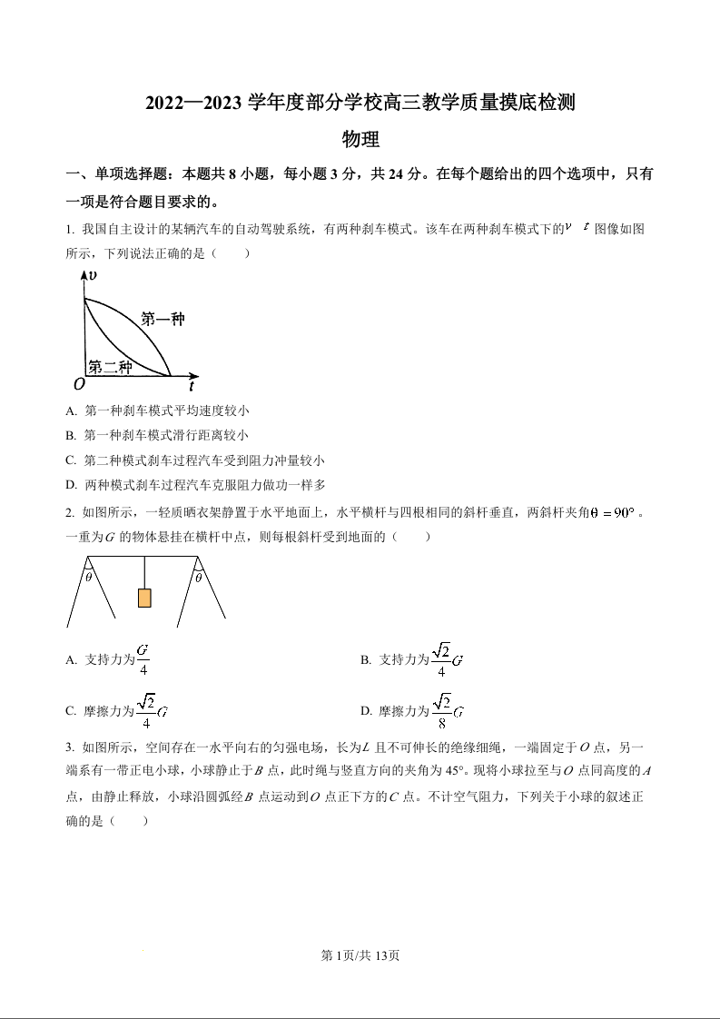 高三物理+答案--山东省淄博市部分学校2022-2023学年高三上学期12月教学质量摸底检测