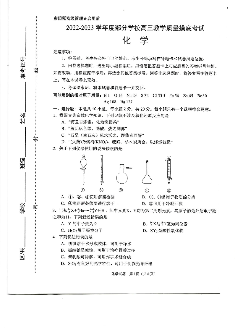 高三化学--山东省淄博市部分学校2022-2023学年高三上学期12月教学质量摸底检测