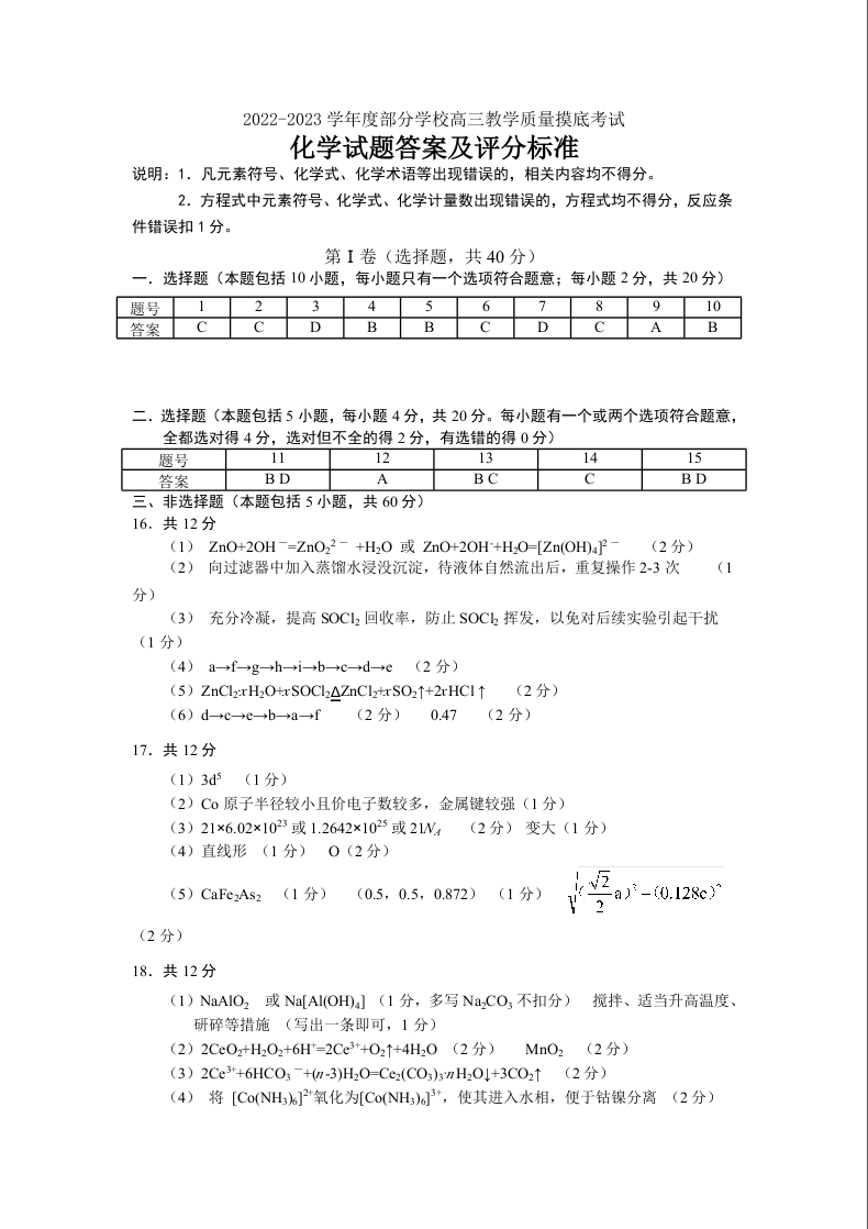 高三化学答案--山东省淄博市部分学校2022-2023学年高三上学期12月教学质量摸底检测