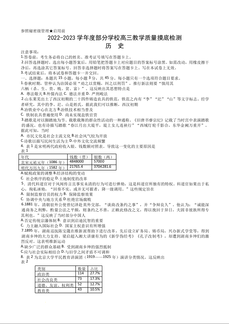 高三历史+答案--山东省淄博市部分学校2022-2023学年高三上学期12月教学质量摸底检测