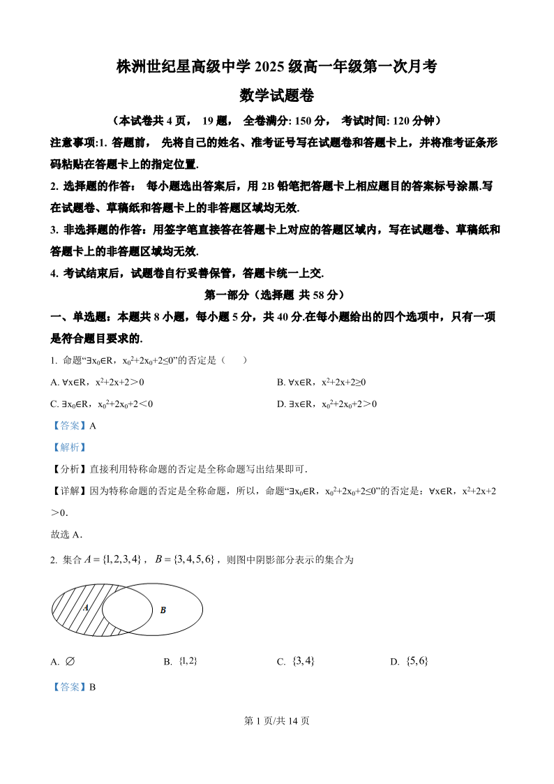 高一数学(精品解析版)--湖南省株洲世纪星高级中学2025-2026学年高一上学期第一次月考