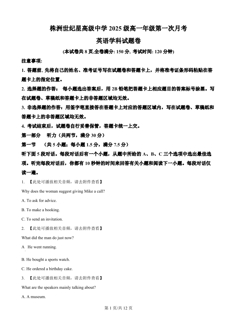 高一英语(原卷版)--湖南省株洲世纪星高级中学2025-2026学年高一上学期第一次月考