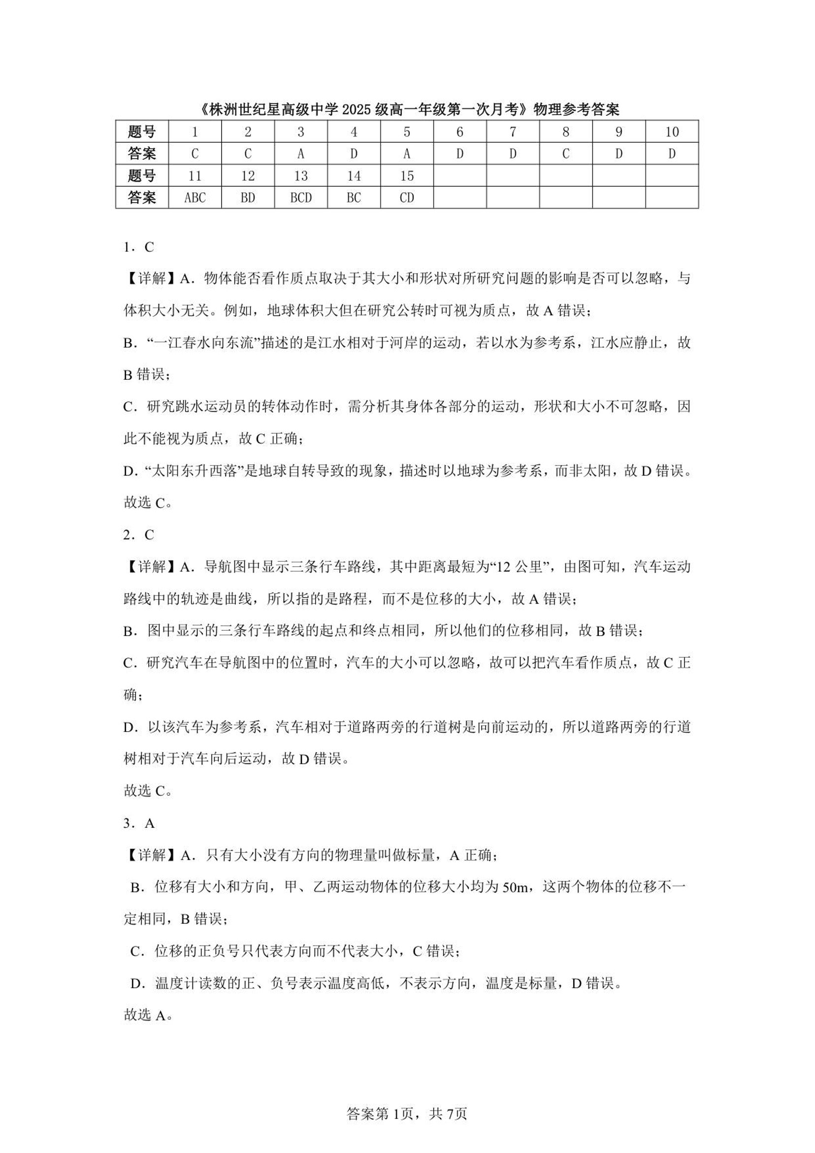 高一物理答案--湖南省株洲世纪星高级中学2025-2026学年高一上学期第一次月考