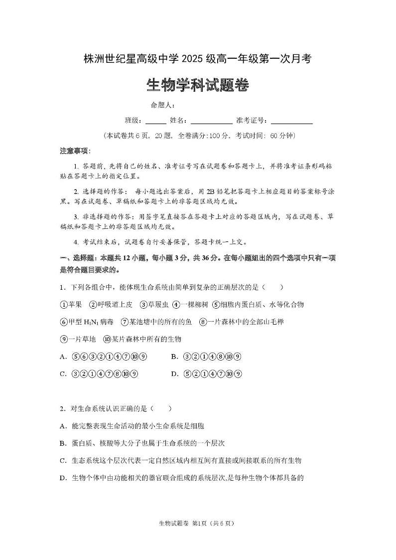 高一生物--湖南省株洲世纪星高级中学2025-2026学年高一上学期第一次月考