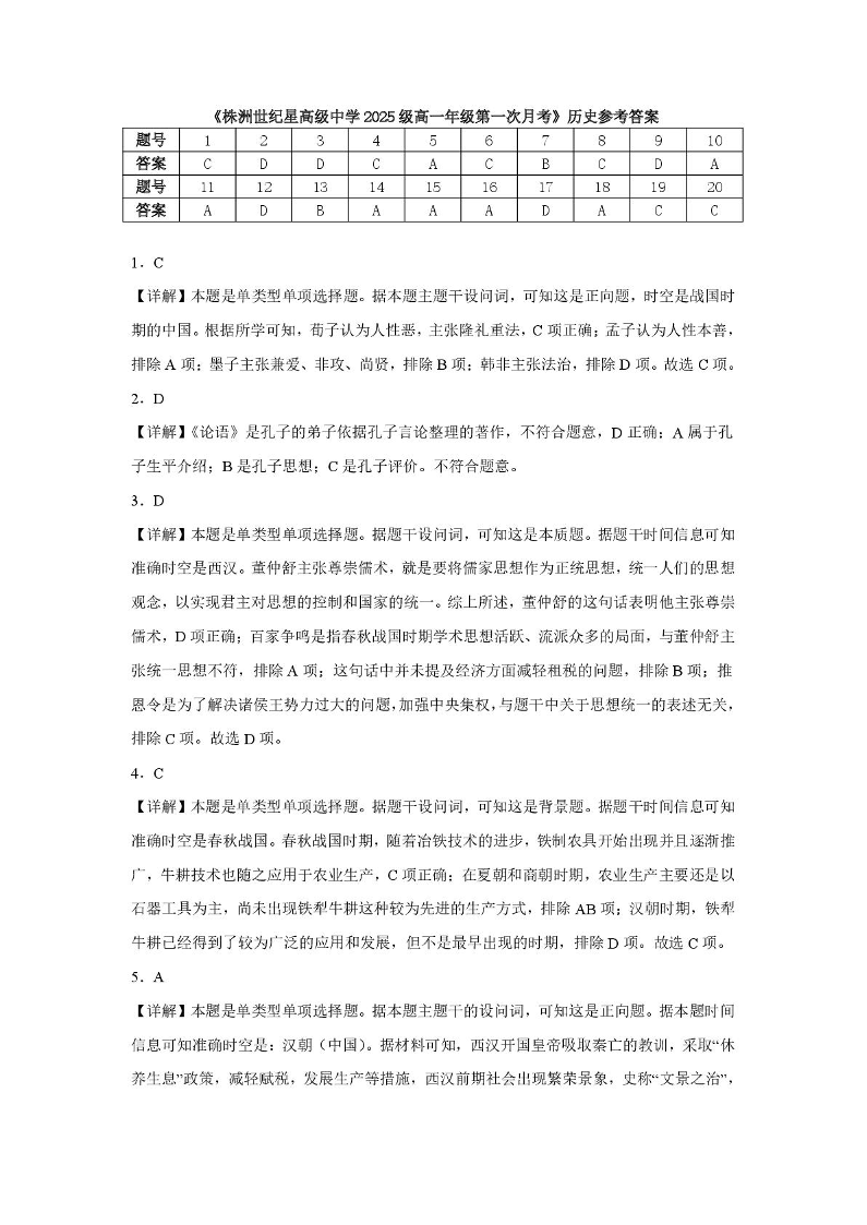 高一历史答案--湖南省株洲世纪星高级中学2025-2026学年高一上学期第一次月考