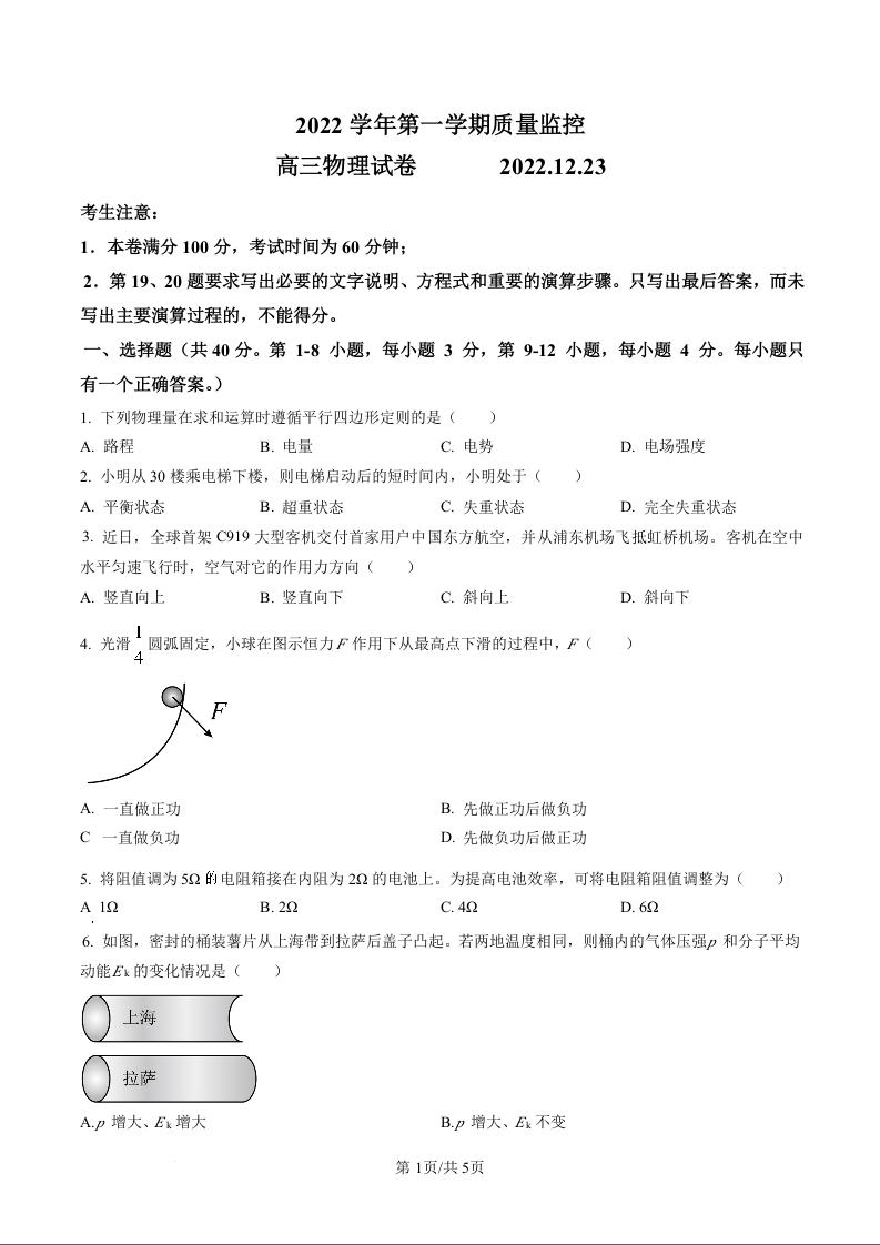 高三物理(原卷版)-上海市金山区2023届高三上学期第一次质量调研(一模)
