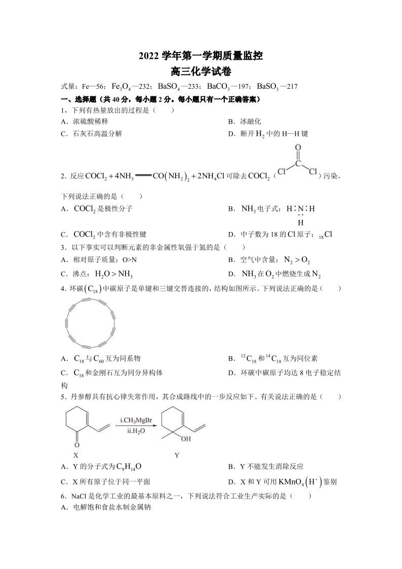 高三化学-上海市金山区2023届高三上学期第一次质量调研(一模)