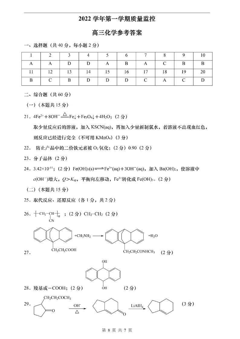 高三化学答案-上海市金山区2023届高三上学期第一次质量调研(一模)