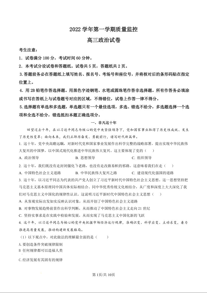 高三政治(精品解析版)-上海市金山区2023届高三上学期第一次质量调研(一模)