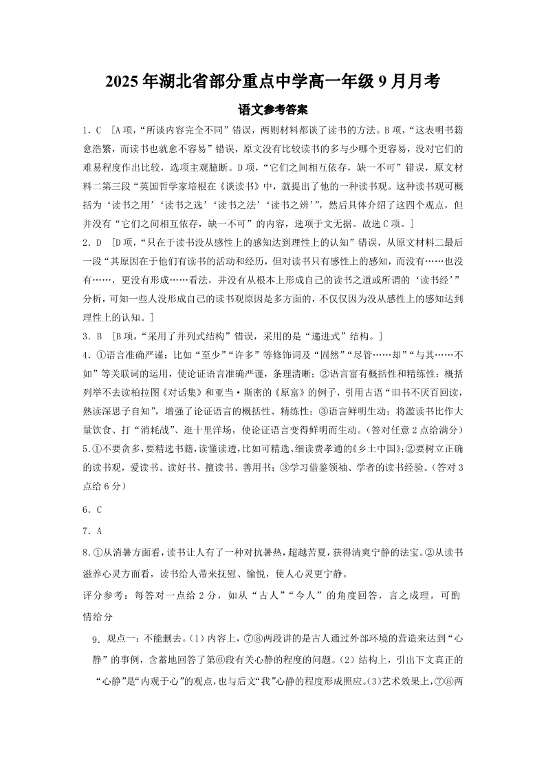高一语文答案--湖北省咸宁市华师元一赤壁学校2025-2026学年高一上学期9月月考