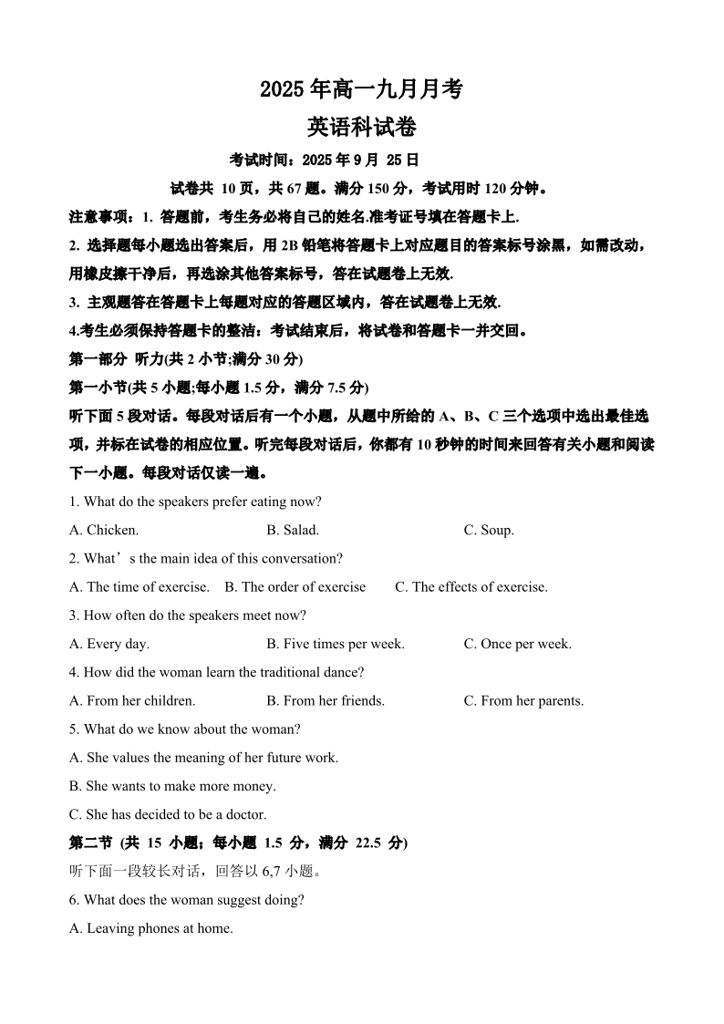 高一英语--湖北省咸宁市华师元一赤壁学校2025-2026学年高一上学期9月月考