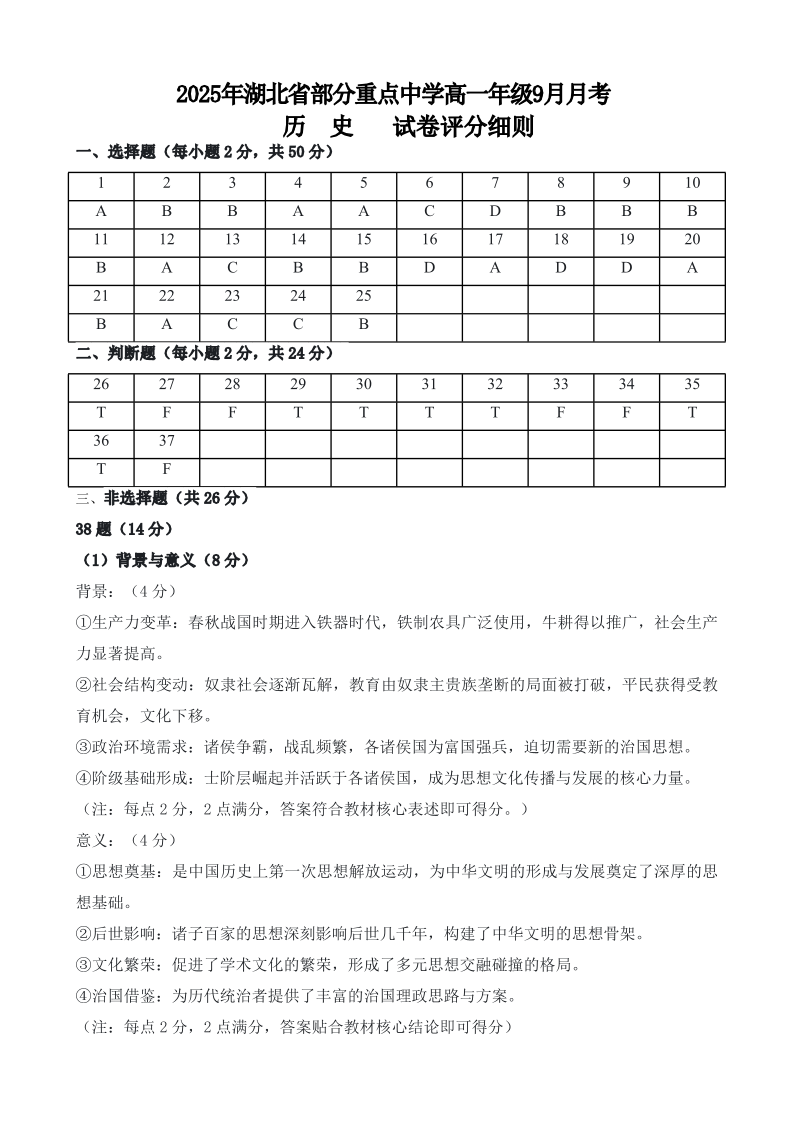 高一历史答案--湖北省咸宁市华师元一赤壁学校2025-2026学年高一上学期9月月考
