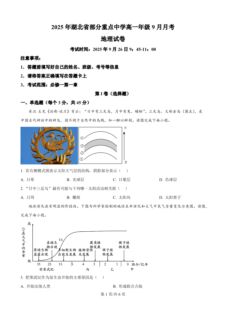 高一地理(原卷版)--湖北省咸宁市华师元一赤壁学校2025-2026学年高一上学期9月月考