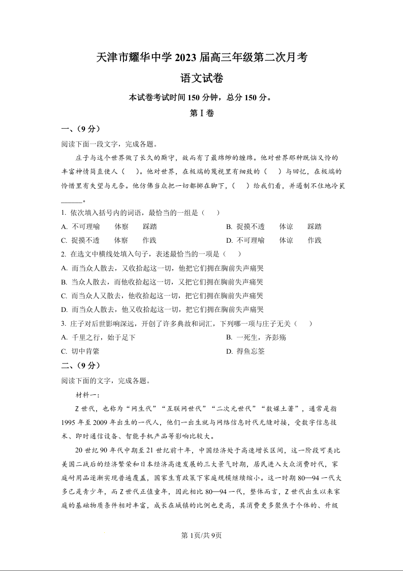 高三语文-天津市耀华中学2023高三上学期11月第二次月考