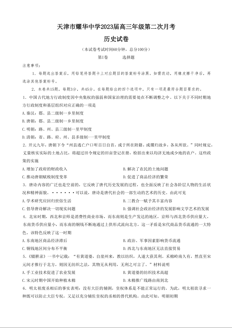 高三历史-天津市耀华中学2023高三上学期11月第二次月考