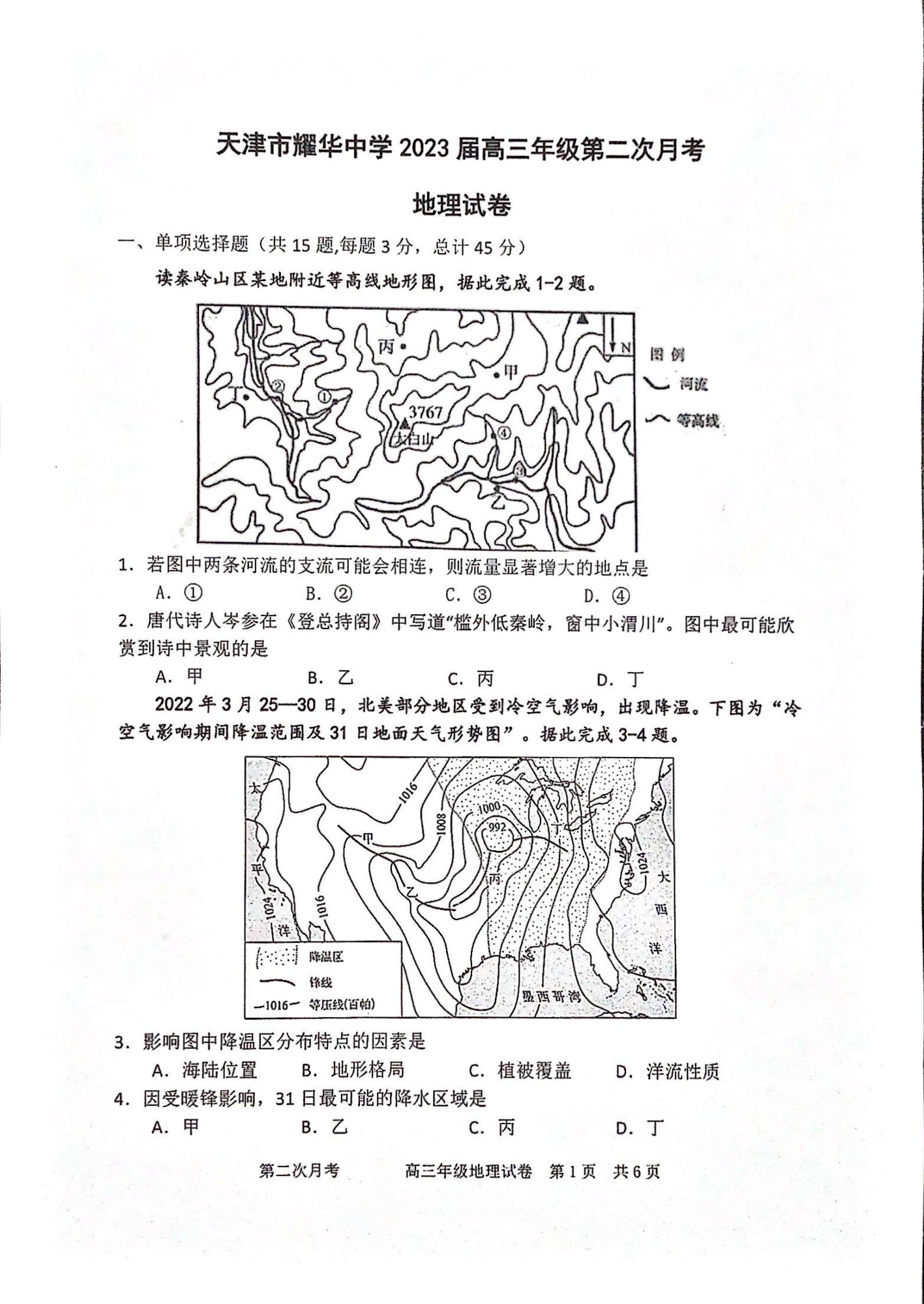 高三地理-天津市耀华中学2023高三上学期11月第二次月考